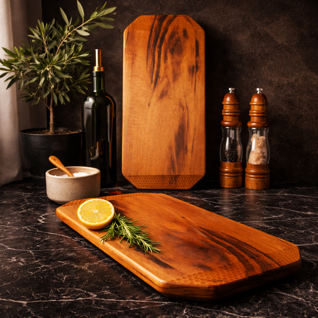 O acabamento acetinado, feito com óleo mineral e cera de abelha, valoriza a textura natural da madeira, proporcionando toque suave e segurança para o uso cotidiano.